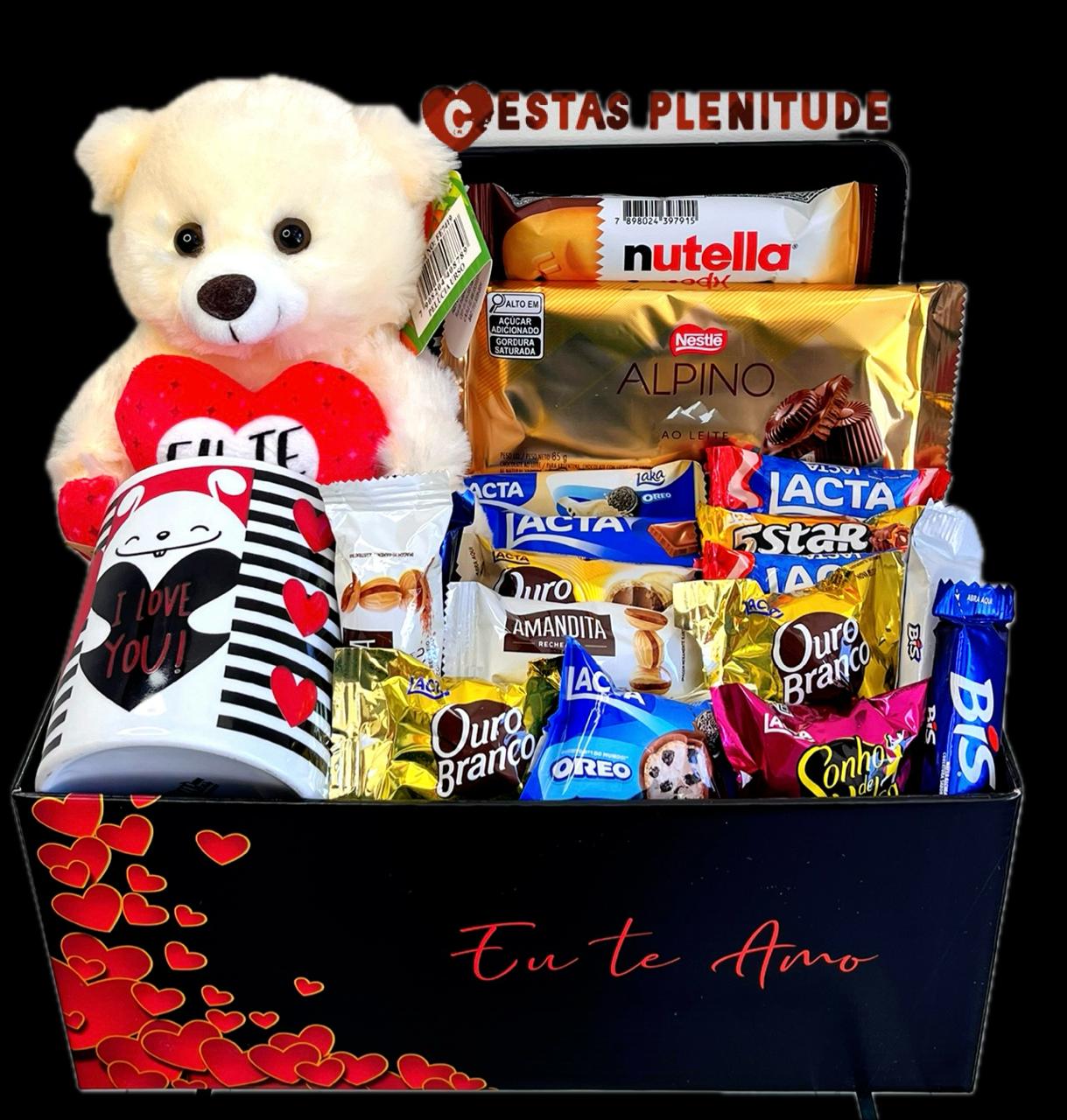 Cesta Caixa Eu Te Amo Descrição: 14 bombons da lacta diversificados; 1 barra de chocolate; 1 nutella b-read; 1 caneca decorada; 1 ursinho pp.   OBS: Na ausência de qualquer item, o mesmo será substituído por algo semelhante.
