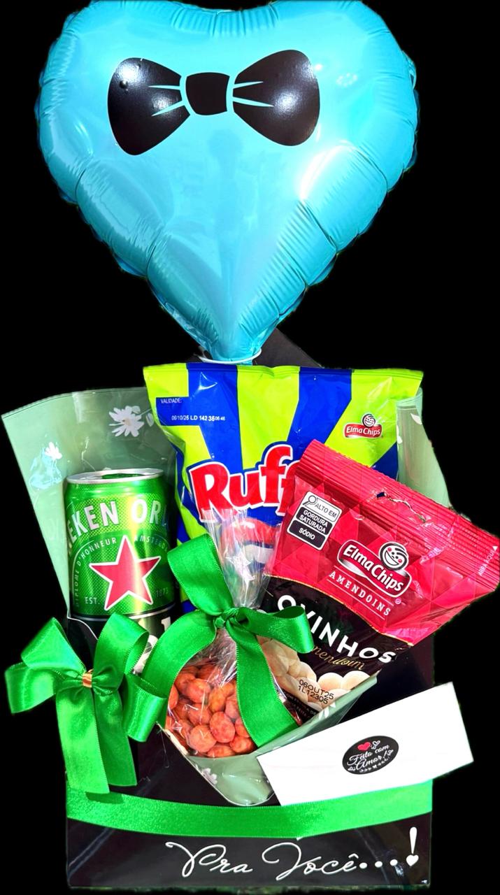 Cesta de Cerveja Mimo; 1 Cesta Box Cartonada enfeitada; 1 Ruffes P 1 Ovinhos 1 Cerveja Heineken lata 1 Amendoim 1 Balão mimo decorado OBS: Na ausência de qualquer item, o mesmo será substituído por outro.
